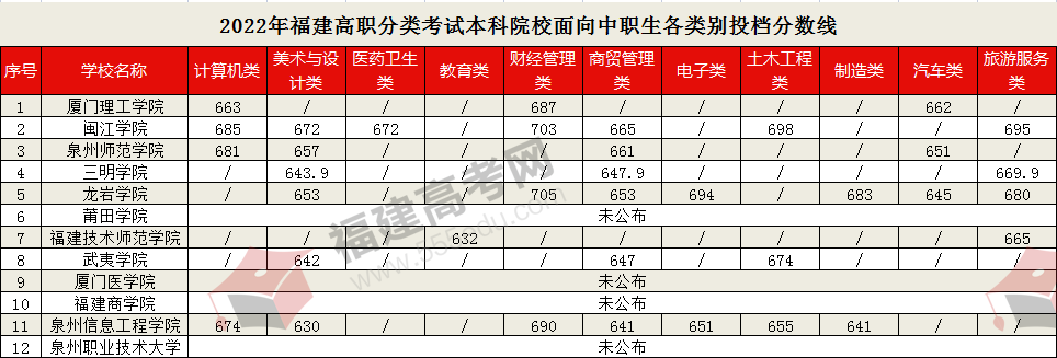 高职分类招考也叫“春季高考”,是中职生的主要升学渠道。福建中职生通过高职分类考试,有机会考上省内本科大学和公办大专。那么福建中职生考本科要多少分?福建中职生能上什么本科大学?小编整理了本科院校不同类别的投档分数线,一起看看吧。