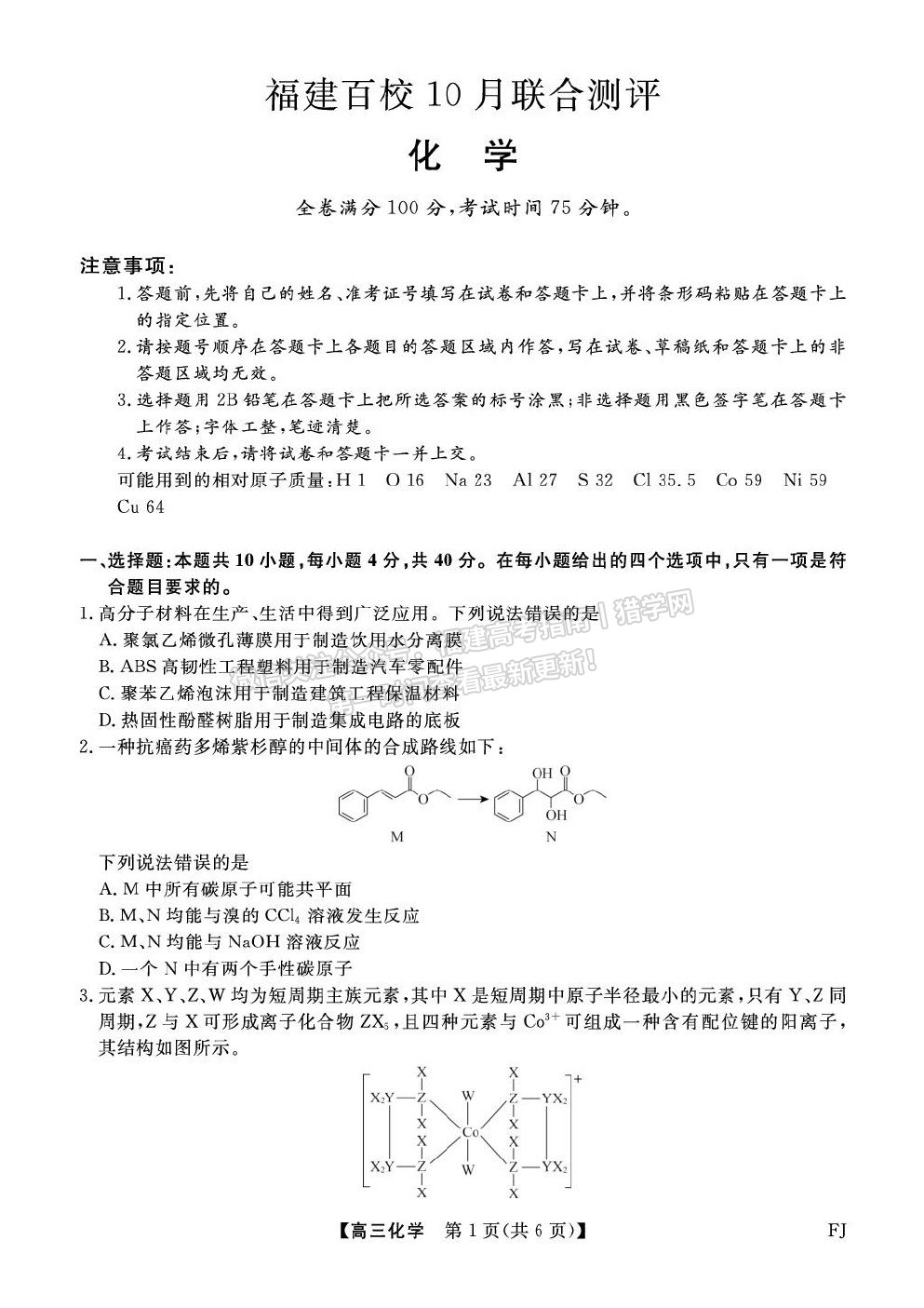 福建省百校2026届高三上学期10月联合测评试卷及答案(全)
