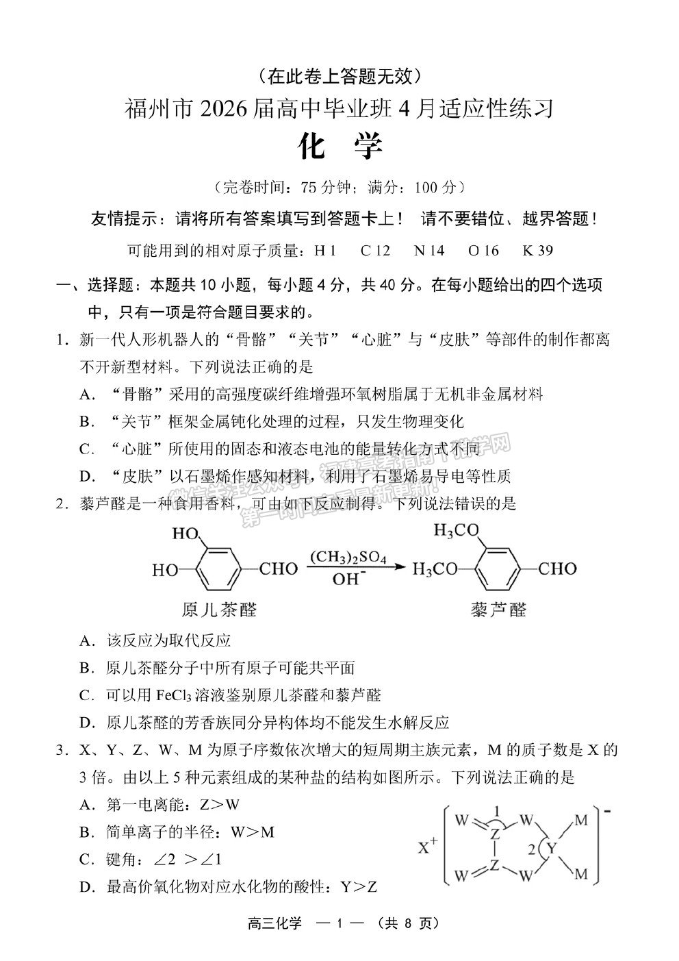 2026届高三【福州】省质检(4.8-4.10)试卷及参考答案(全)
