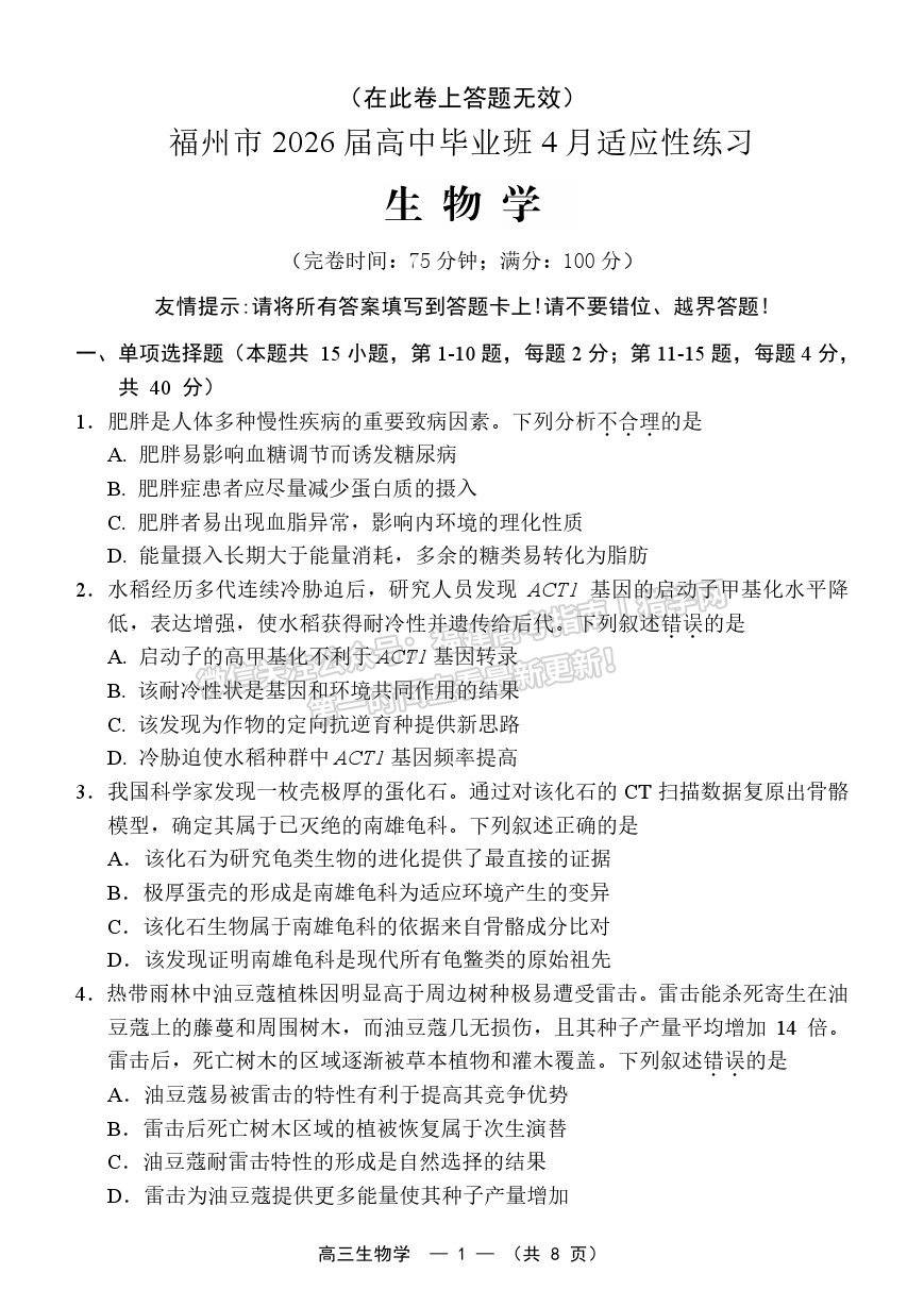 2026届福建高三省质检生物试卷及参考答案(福州)