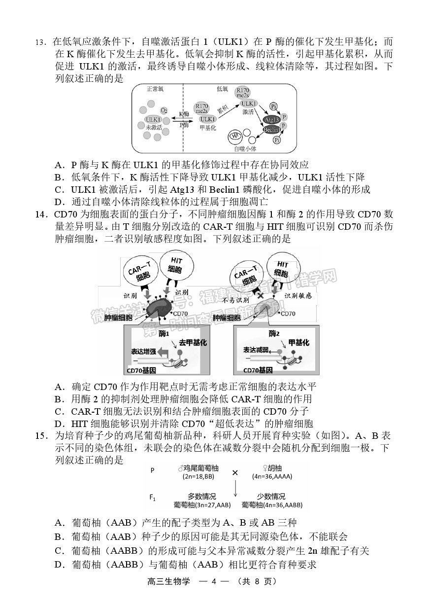 当前位置: 首页 > 复习备考 > 模拟试题 > 理综 > 2026届福建高三省质检生物试卷及参考答案(福州)