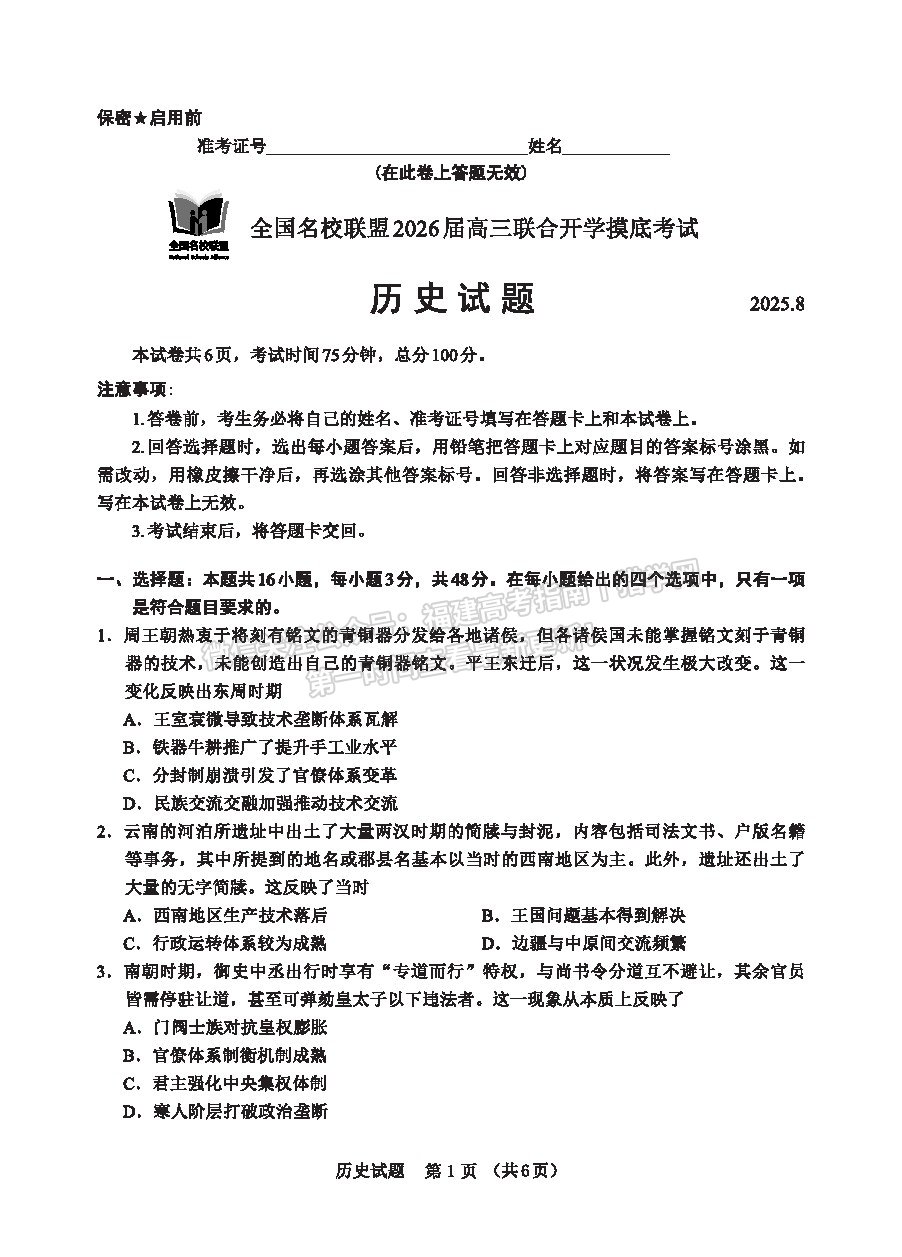 当前位置: 首页 > 复习备考 > 模拟试题 > 文综 > 全国名校联盟2026届高三联合开学摸底考试历史试题及答案