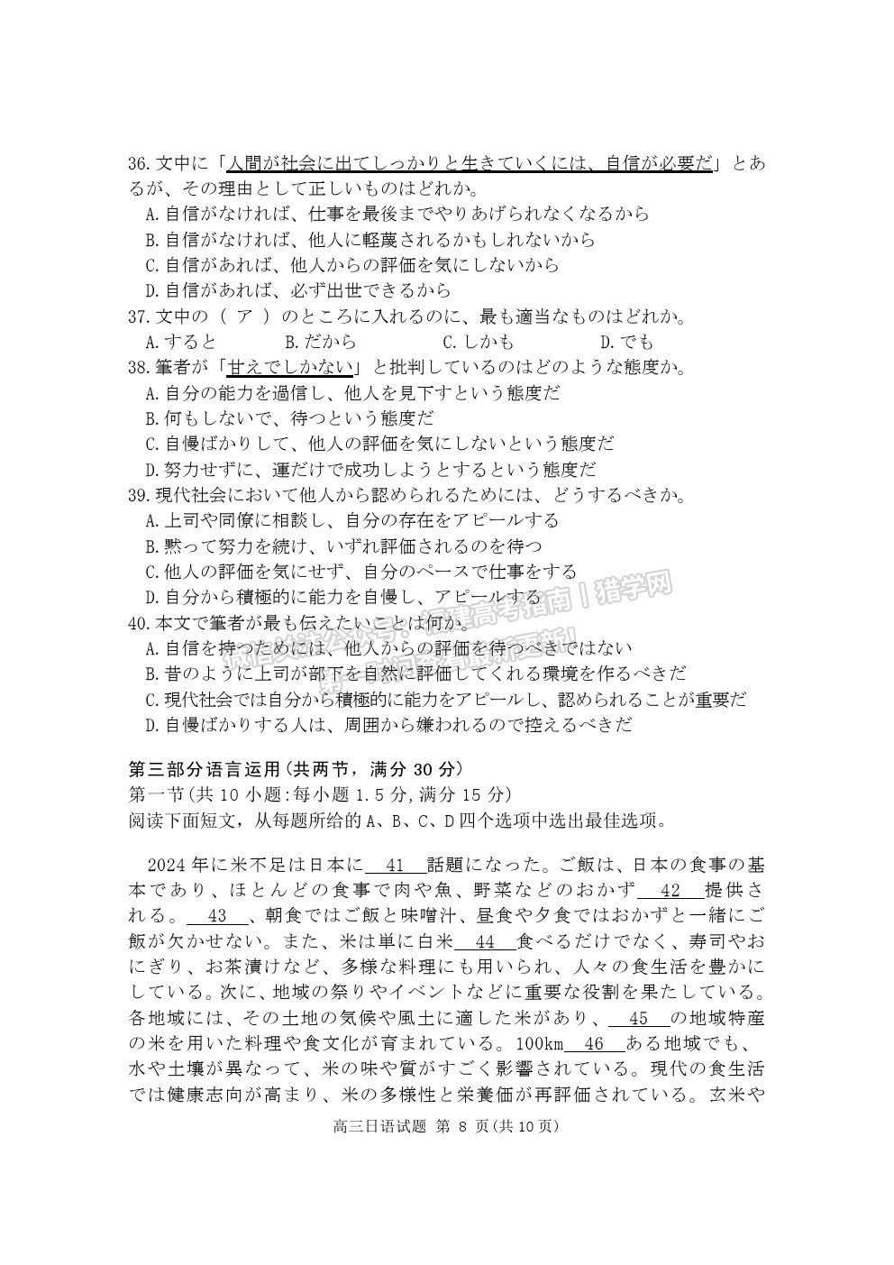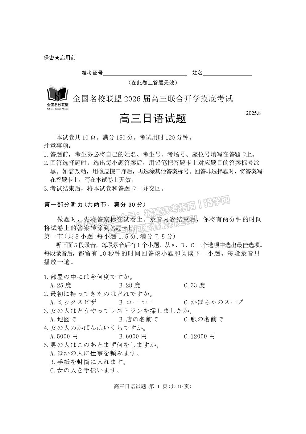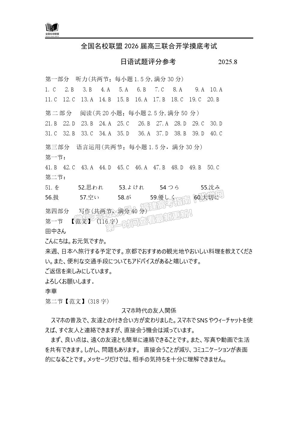 全国名校联盟2026届高三联合开学摸底考试日语试题及答案