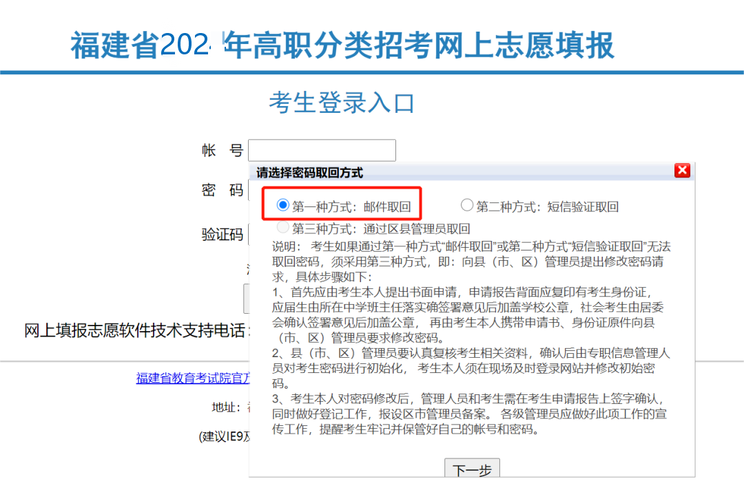 说明:考生如果通过第一种方式“邮件取回”或第二种方式“短信验证取回”无法取回密码,须采用第三种方式,即:向县(市、区)管理员提出修改密码请求,具体步骤如下: