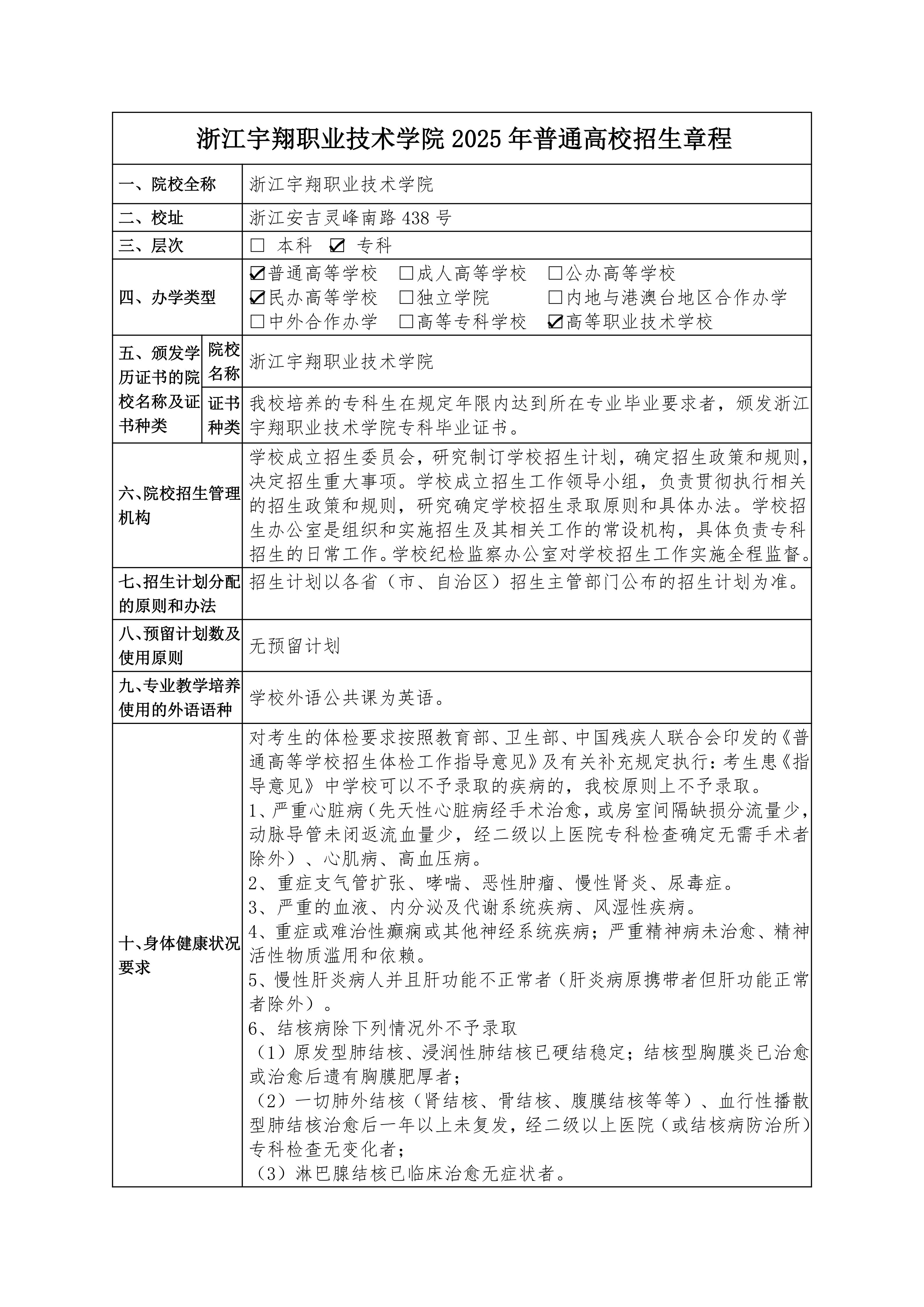 浙江宇翔职业技术学院2025年普通高校招生章程