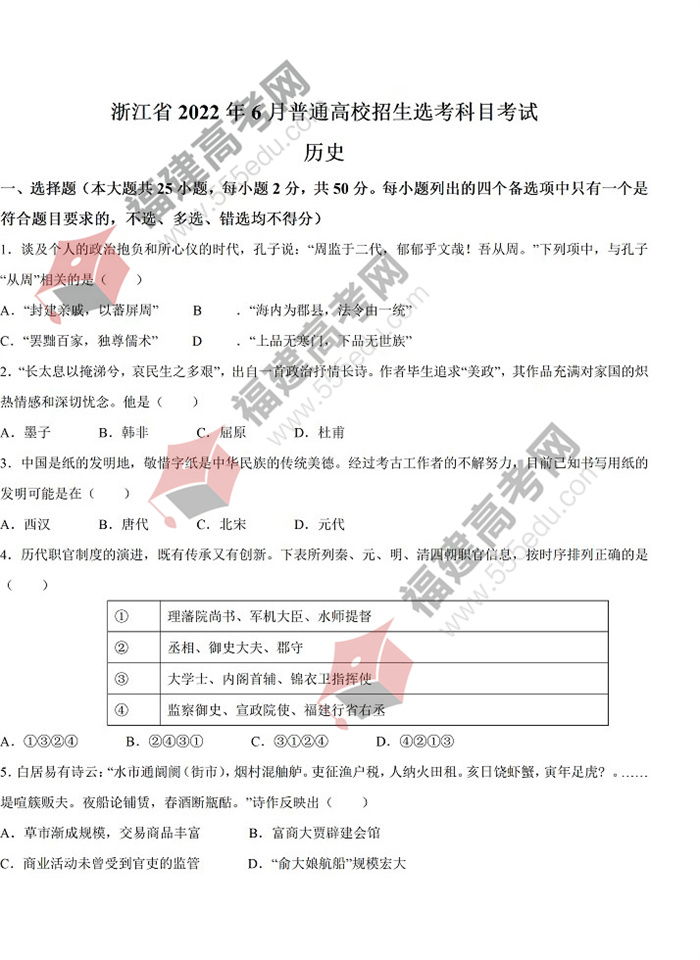 2022年浙江高考历史真题已经公布。更多2022年高考分数线、2022年高考志愿填报、2022年高考成绩查询等资讯,关注浙江高考网。